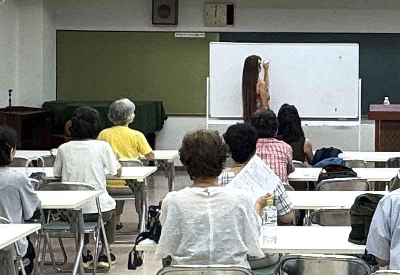 私は 「フラダンスで感じるハワイの文化」 をテーマに、ハワイ語やハワイの歴史に基づく文化背景についてお話しし、さらに フラダンス(古典フラ、現代フラ) を実際に体験していただきました。